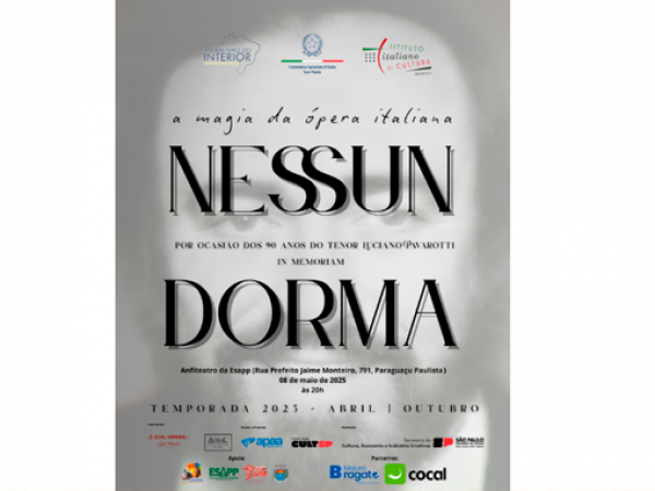 O projeto vai levar para diversas cidades do oeste paulista o espetáculo gratuito “Nessun Dorma – A Magia da Ópera Italiana”, uma celebração especial ao tenor italiano Luciano Pavarotti (1935 – 2007), que completaria 90 anos em 2025. Um espetáculo cênico que reúne trechos populares de grandes óperas italianas, com solistas, cenografia e legendas em português.