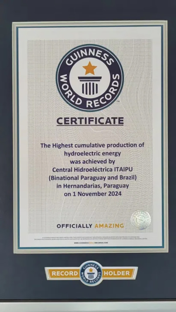 Itaipu Binacional alcançou mais um feito histórico. A usina , localizada entre o Brasil e o Paraguai, desbanca outra vez a hidrelétrica Três Gargantas, da China, e foi incluída no Guinness Book pela “maior produção de energia elétrica acumulada” do mundo. O título foi anunciado em um evento especial na margem brasileira, em Foz do Iguaçu, no dia 1 de novembro de 2024.
